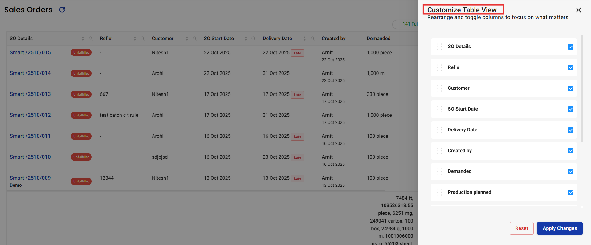 You can easily rearrange, show, or hide columns as per your workflow using the Customize Table View option available on the top-right corner of each screen.