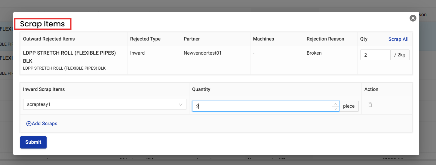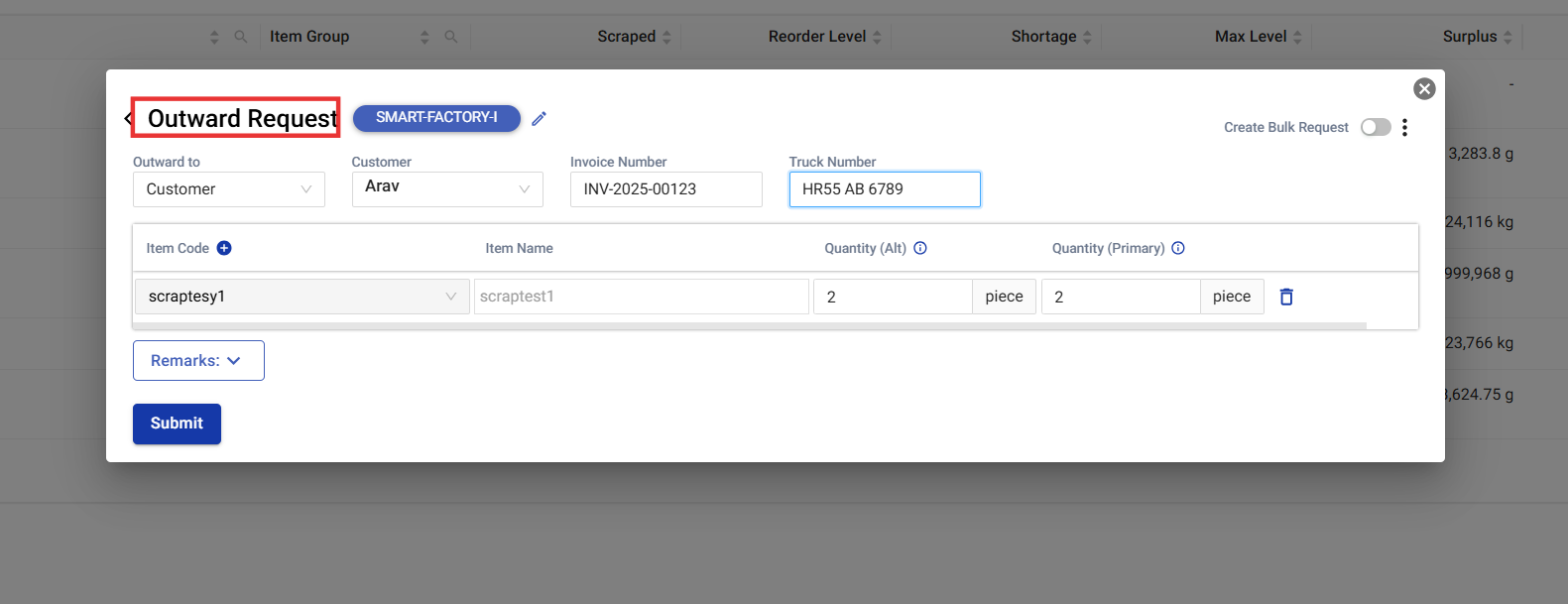 The system will generate an outward request and confirm with “Items scrapped successfully.”