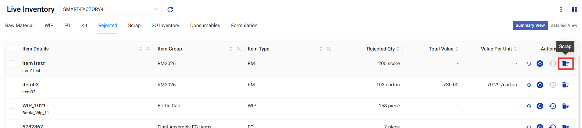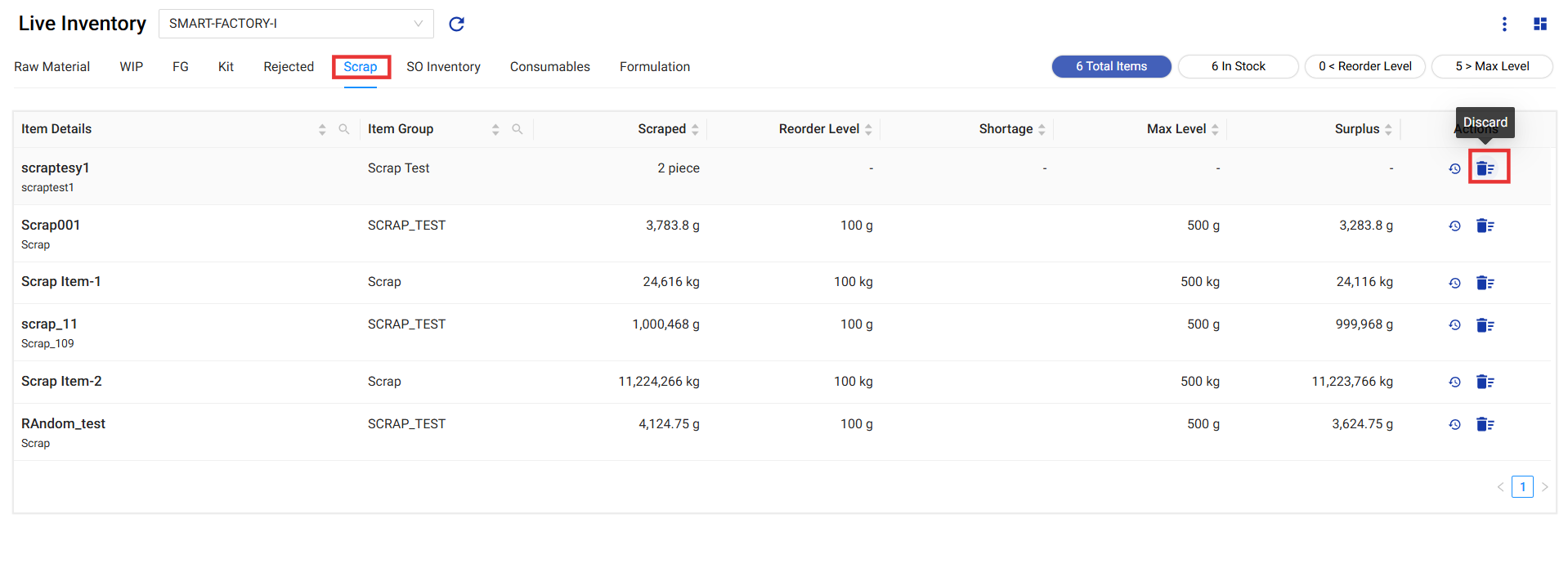 Here you can see all scrap items with details like Scrapped Qty, Reorder Level, and Surplus.