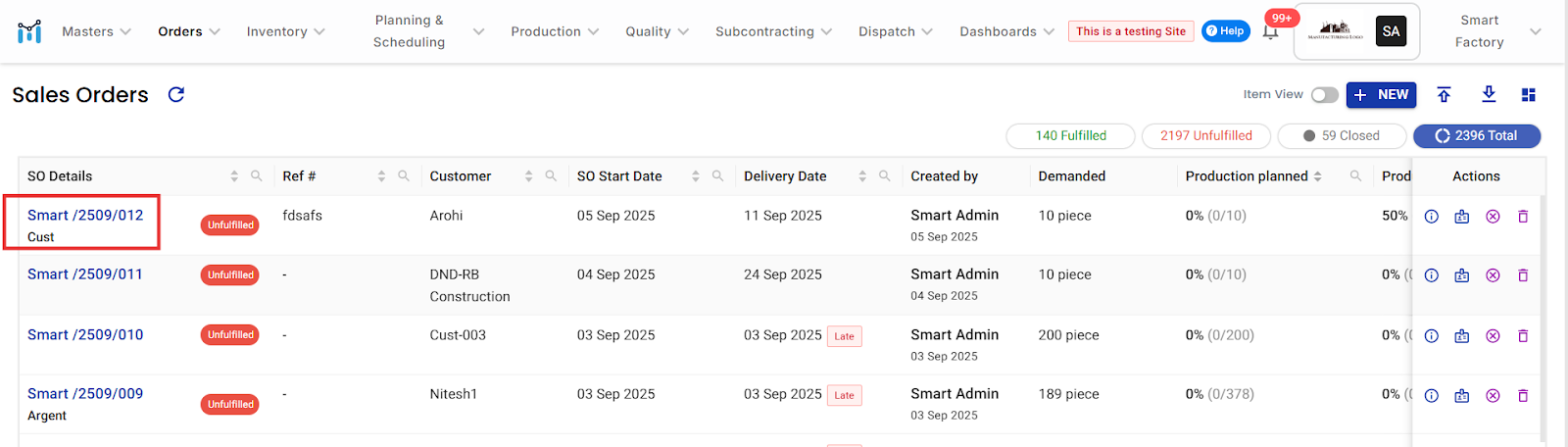 Find the relevant Sales Order (e.g., Smart / 2509/012).