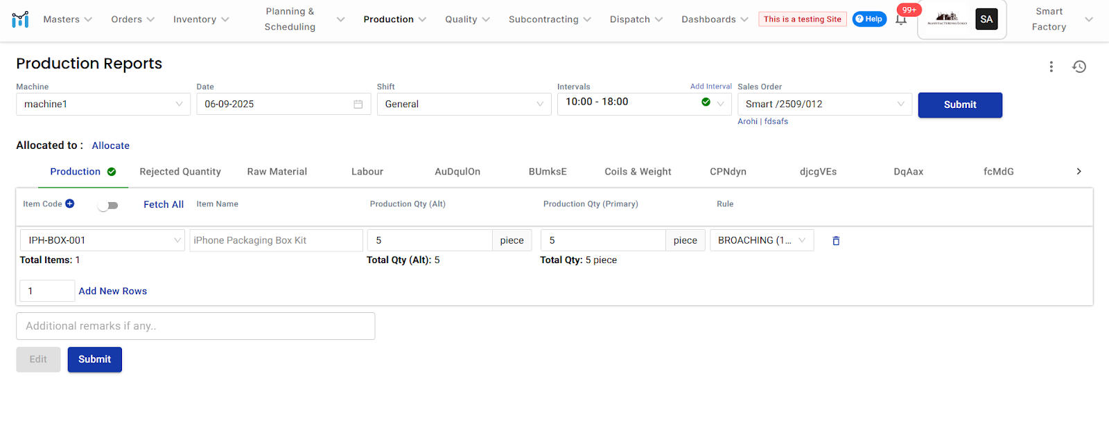 Enter the Item Details (e.g., Quantity Produced, Wastage, etc.).
