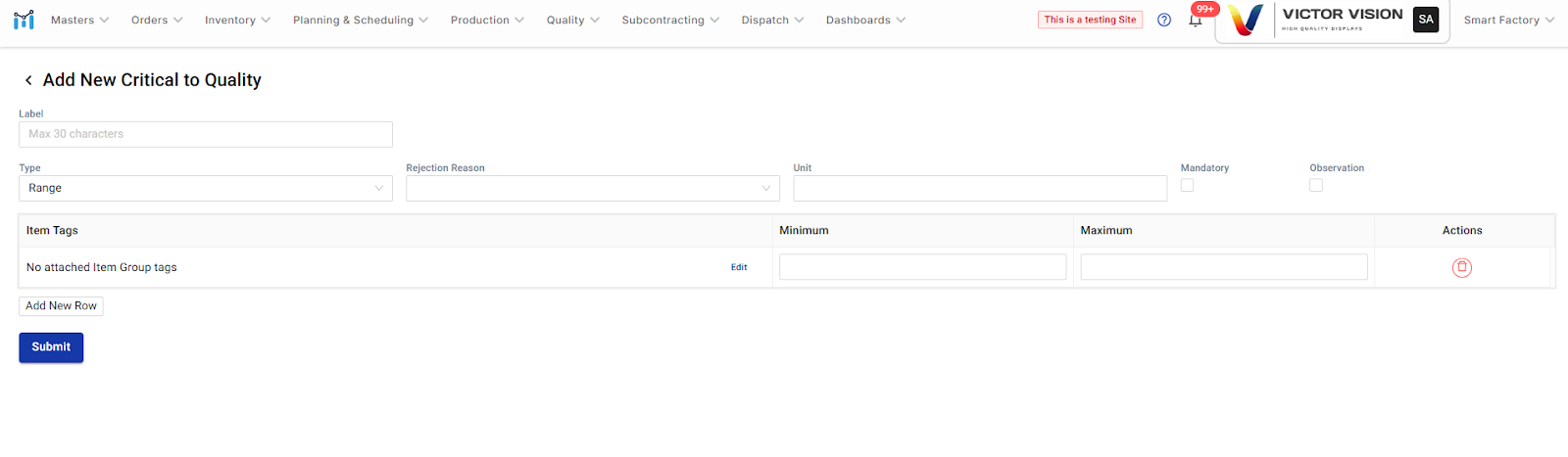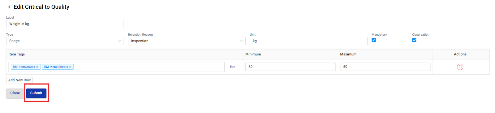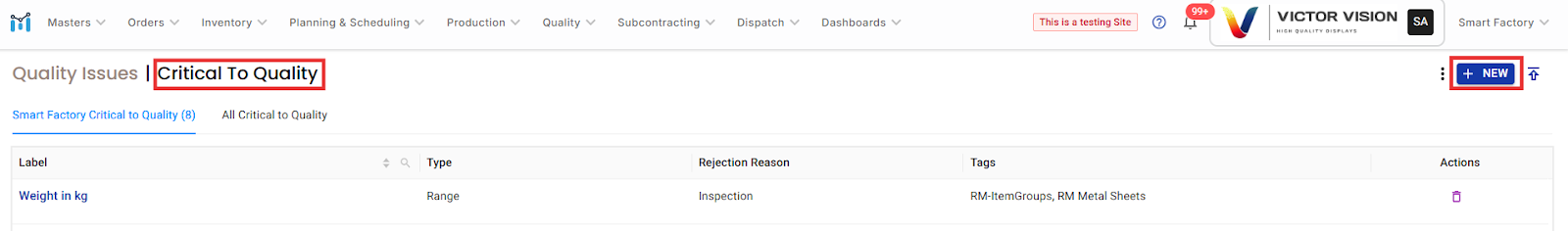 Your new CTQ parameter is now active and will be available during quality checks (like IQC or in-process inspections) for the tagged items.