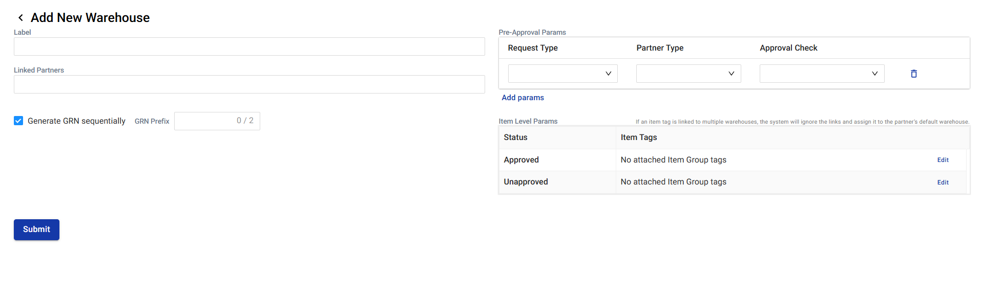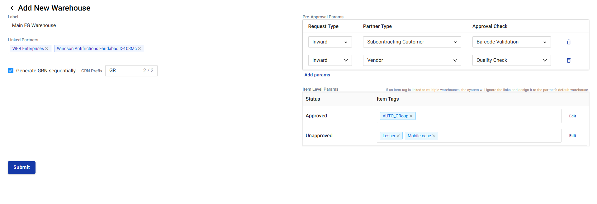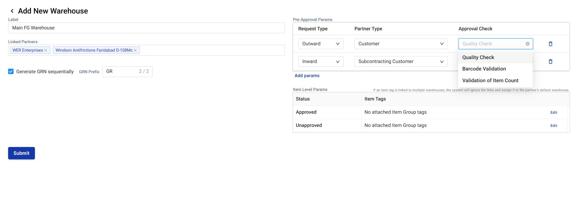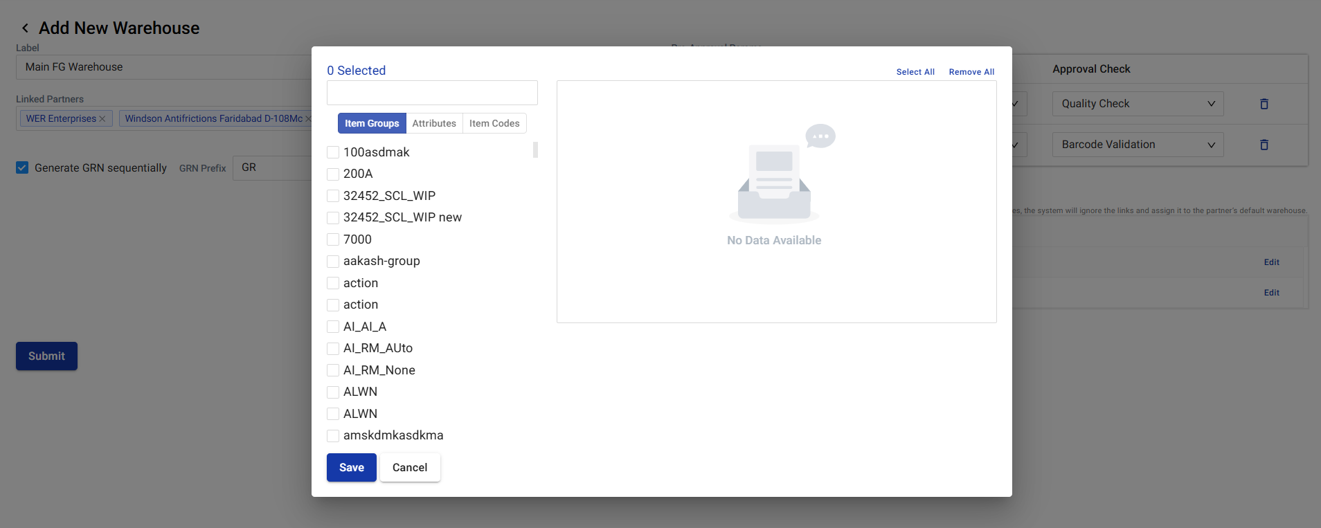 By creating warehouses with structured labels, GRN prefixes, pre-approval flows, and item tags, the system ensures: