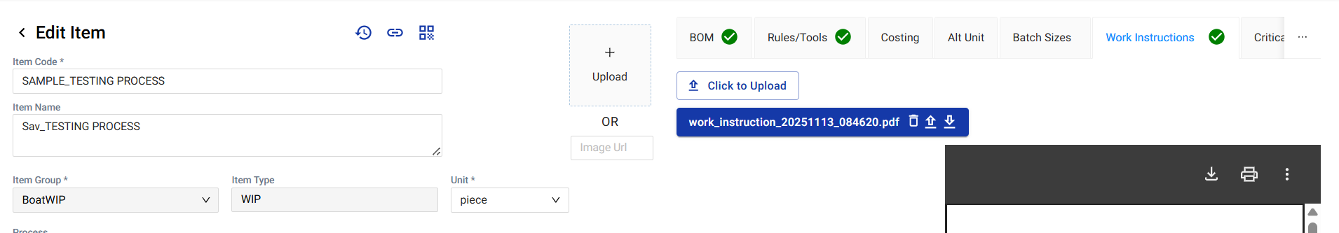 Anyone involved in production who has access to the item or job card can: View the Work Instruction on the shop floor screen, job card, or item view Open the PDF without downloading it Ensure they are following updated SOPs (Standard Operating ...