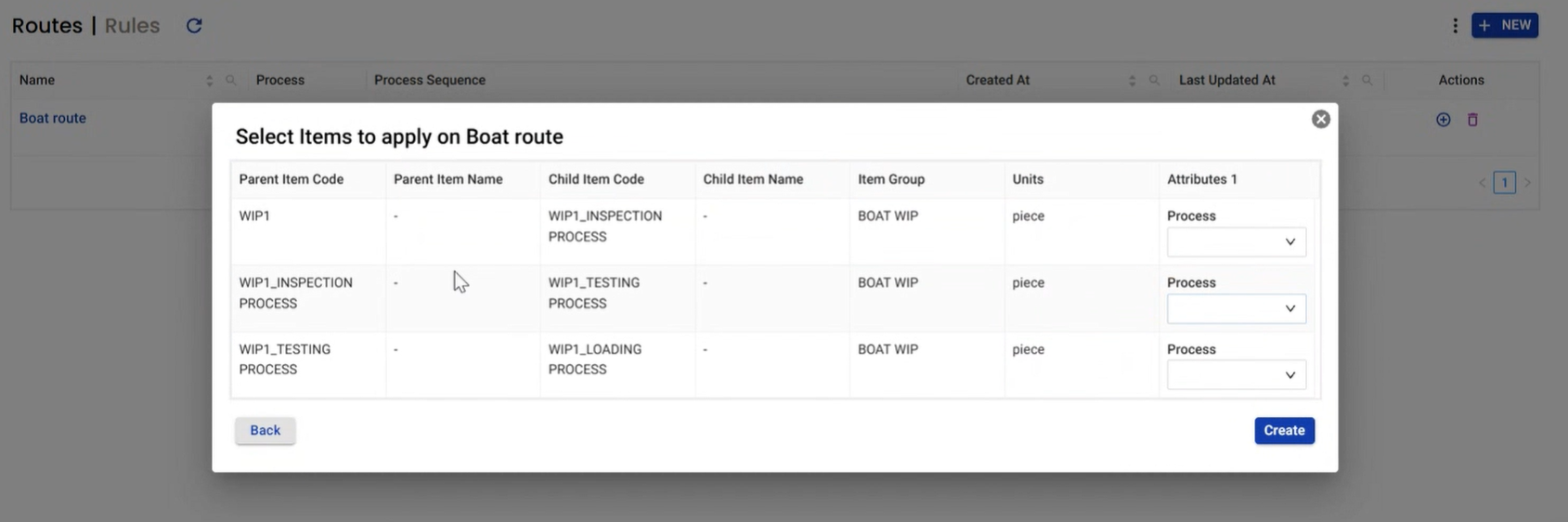 In the Attributes column (example: Process dropdown), select the correct process value (Inspection / Testing / Cutting etc.)