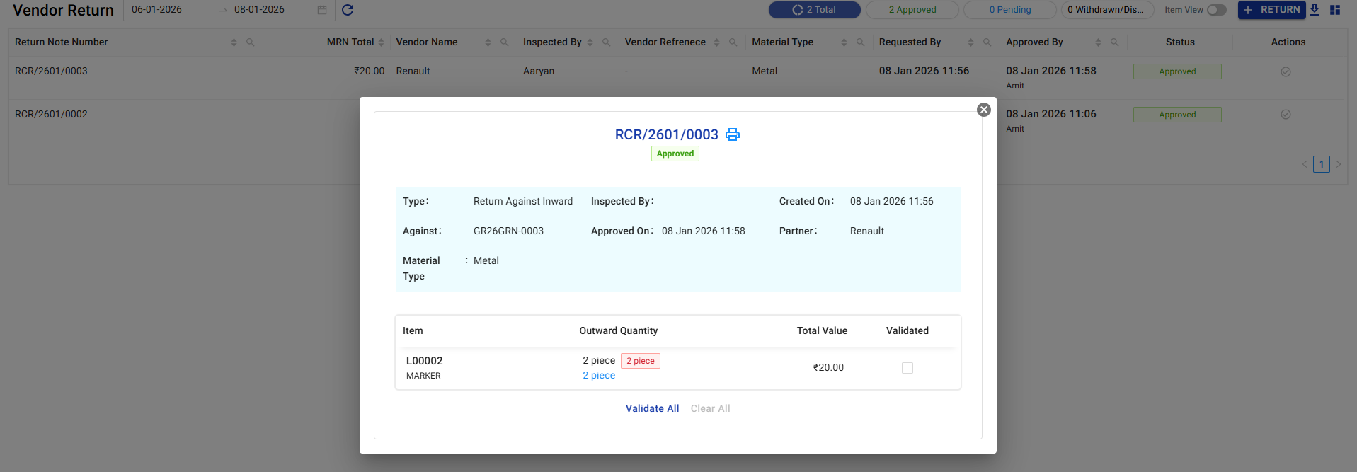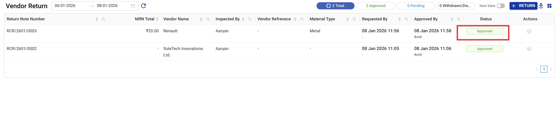 With a single list view and downloadable documents, users can confidently manage vendor returns without inventory mismatches or process delays.