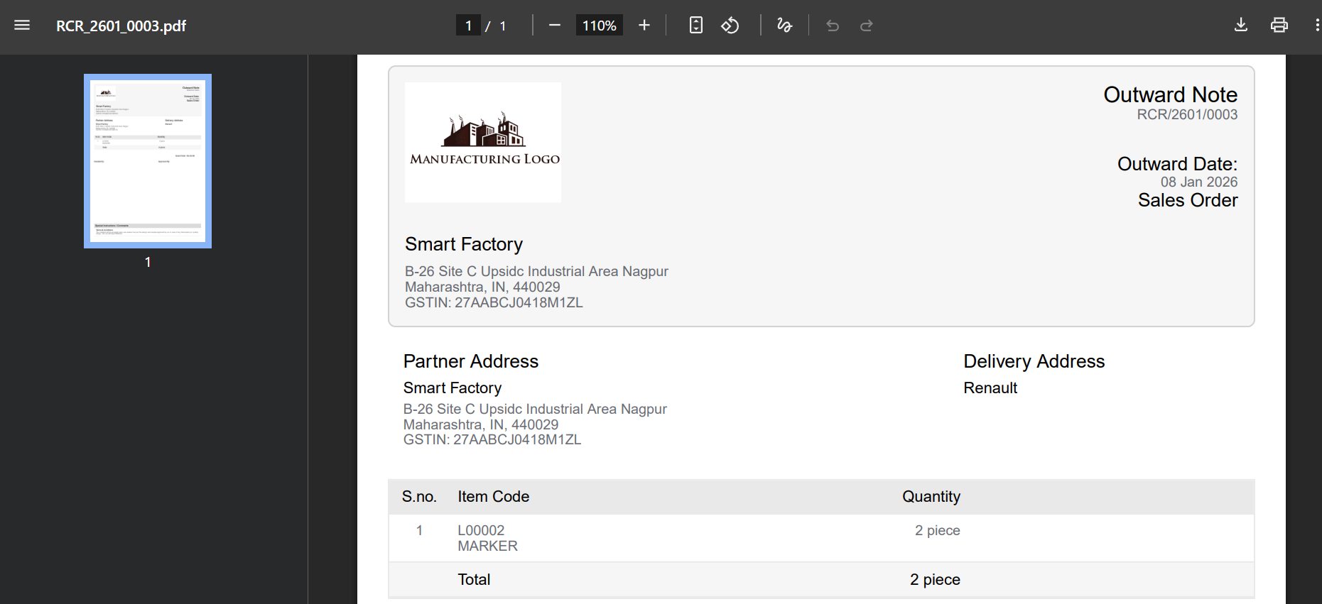 Open the approved return and download the PDF outward note for vendor communication, physical dispatch, and audit records.