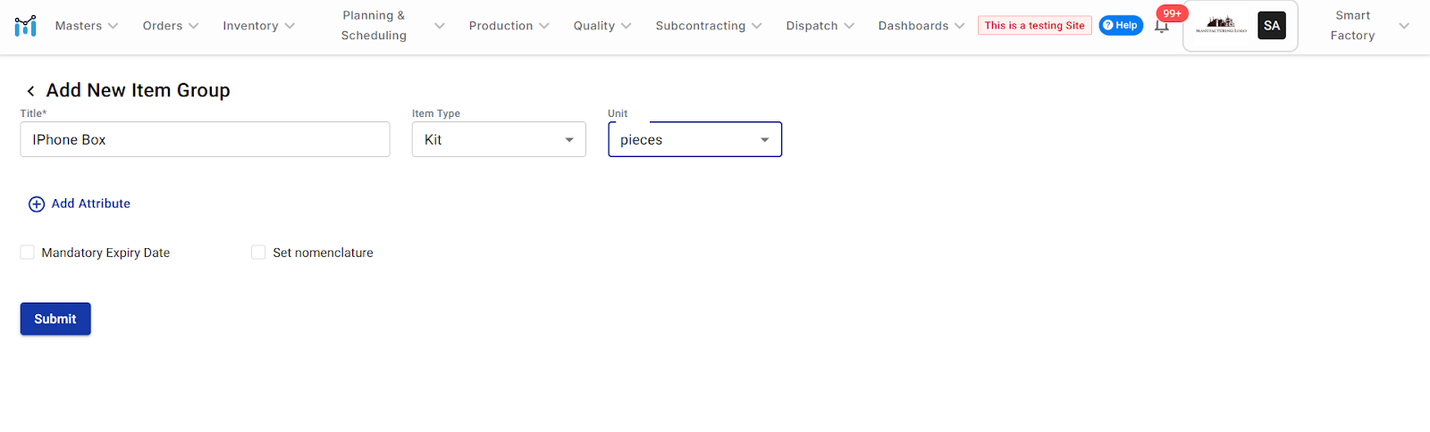 By following these steps, you can successfully create an Item Group with Item Type = Kit in ManufApp. This allows you to manage bundled items together, track them under a single category, and ensure consistency in production and inventory operations.