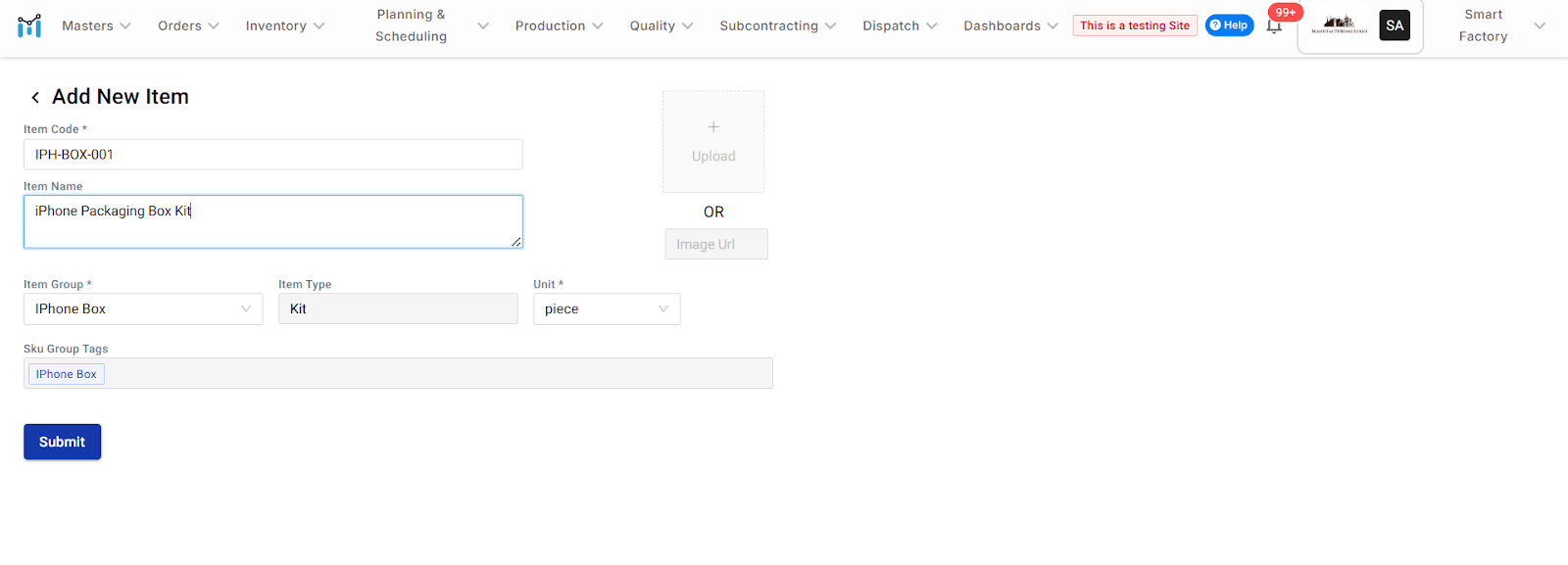 🎯 Objective To create a new Item Group in ManufApp with the Item Type = Kit, so that multiple items can be bundled together as a kit for production, inventory, or dispatch purposes. 📝 Steps Navigate to Masters → Items From the top menu, go to ...