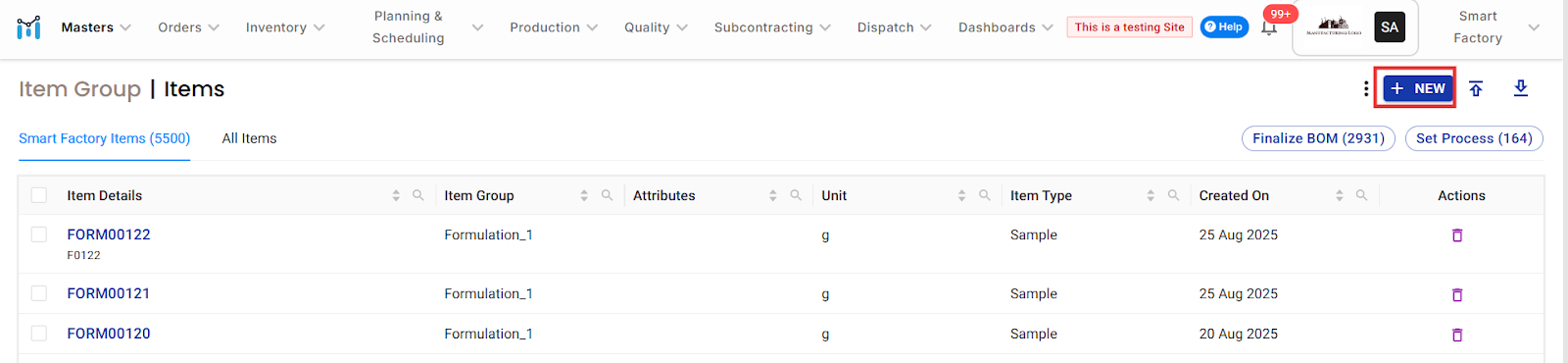ManufApp makes item creation fast and intelligent by auto-filling key fields based on your selections. This reduces manual work and ensures consistency across your item master. Step 1: Go to Items Master Navigate to: Masters > Items Step 2: Click “+ ...