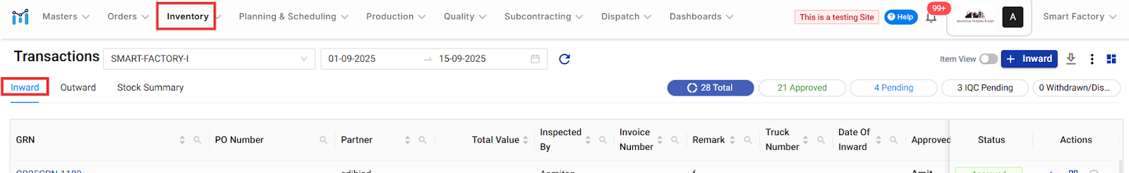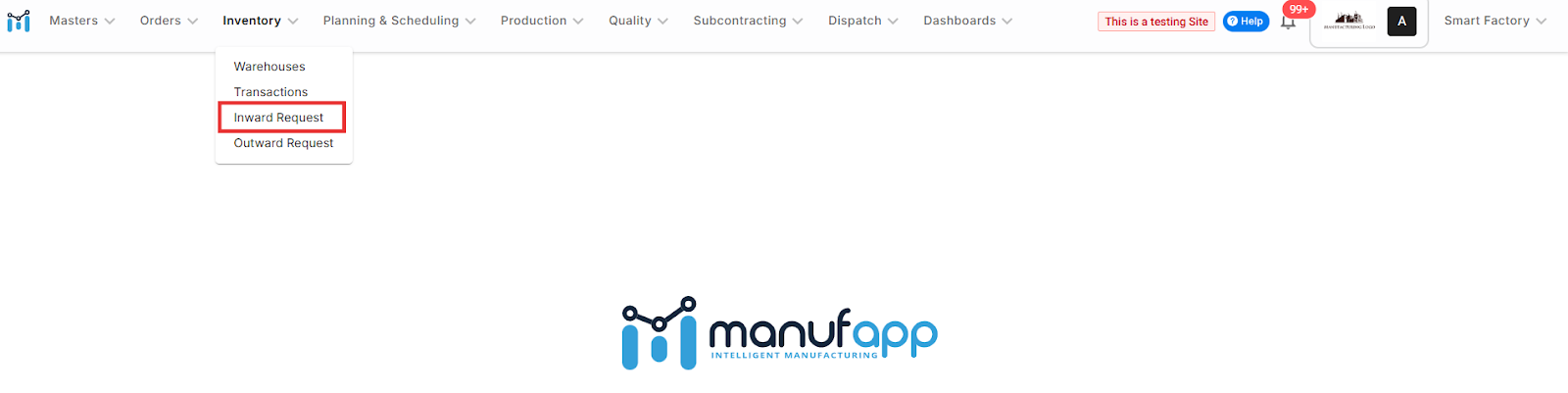 Use this guide when materials are received against a pre-approved Purchase Order (PO) — ensuring consistency and traceability in procurement. For a quick overview, see: What is an Inward Request in ManufApp? Step 1: Navigate to Inward Request Go to: ...