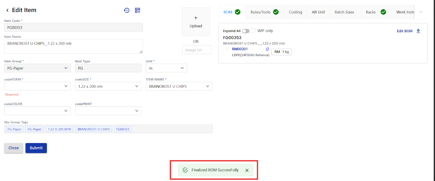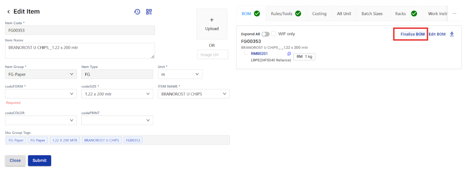 Finalizing also ensures that the routing structure (process flow) is properly created in the system, so production can run seamlessly without configuration issues.