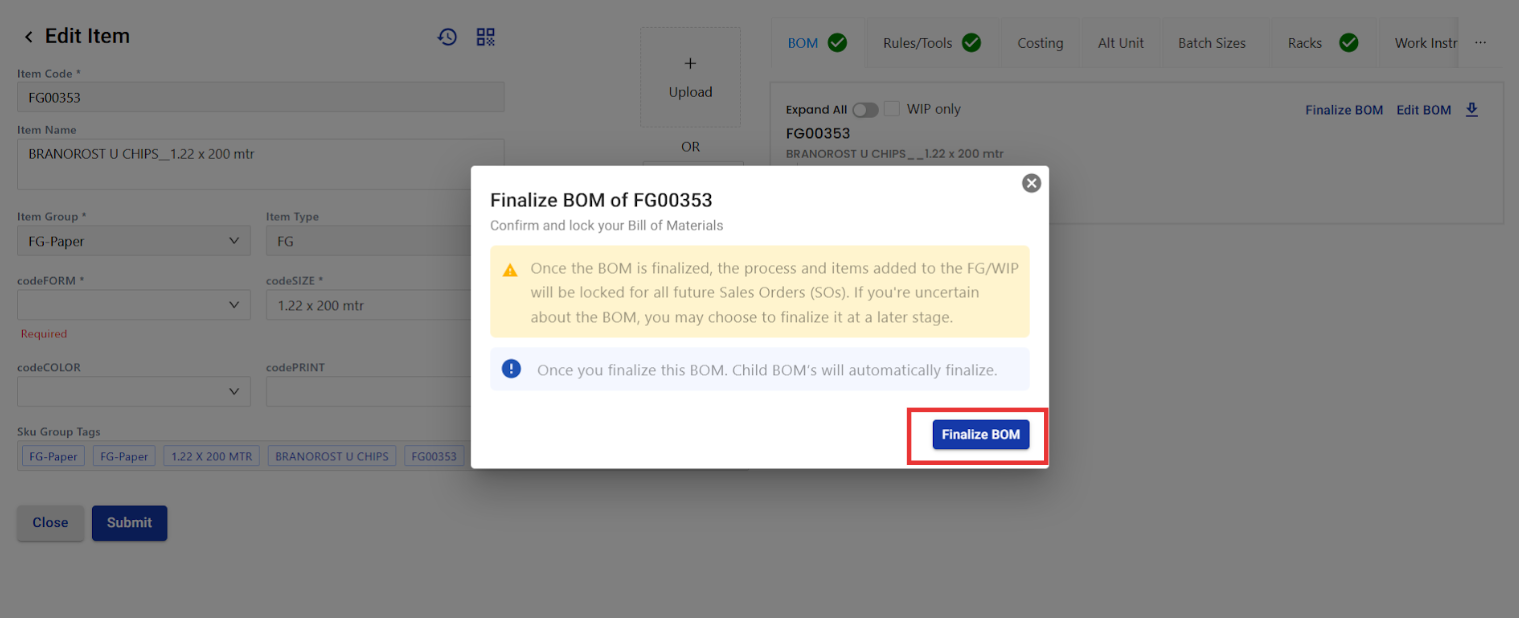 A confirmation pop-up will appear, explaining that finalizing will lock the BOM for future Sales Orders.