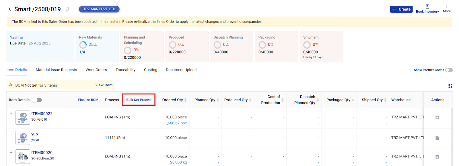 To quickly define and apply cycle-time rules for multiple items within a Sales Order in a single operation. The Bulk Set Process allows planners to assign machine groups, process steps, and expected cycle times without updating each item individually, ensuring consistent production planning data across the entire order.