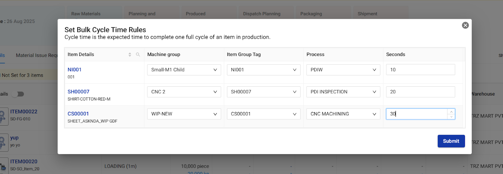 The Bulk Set Process helps you update cycle-time rules for multiple items inside a sales order in one shot. Instead of editing each item individually, you can assign machine groups, process steps, and cycle-time seconds in a single action—reducing setup time and ensuring consistent planning data across the entire order.