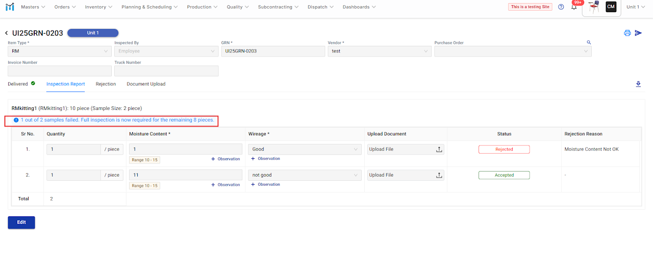 Once all the inspections are completed based on the sampling results, submit the IQC results.