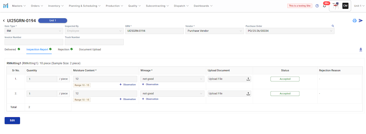 Only users with the appropriate roles (usually from the Quality or Stores team) can perform IQC. During the IQC process, the following are recorded: Rejection Reason (e.g., Crack, Rust, Bubbling) from a dropdown list Rejected Quantity (how many ...