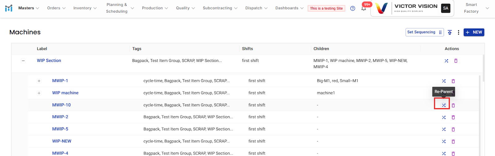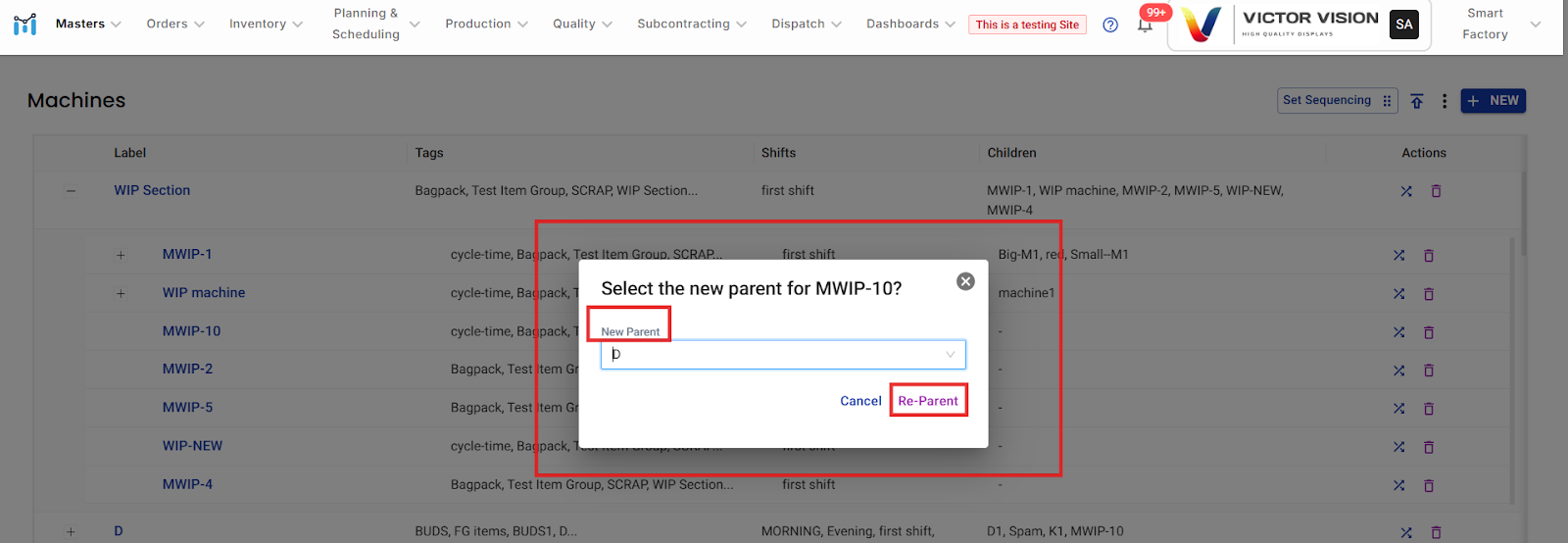 Re-parenting a machine helps organize your production setup by assigning child machines under a logical parent group. Follow these steps to re-structure your machine hierarchy.