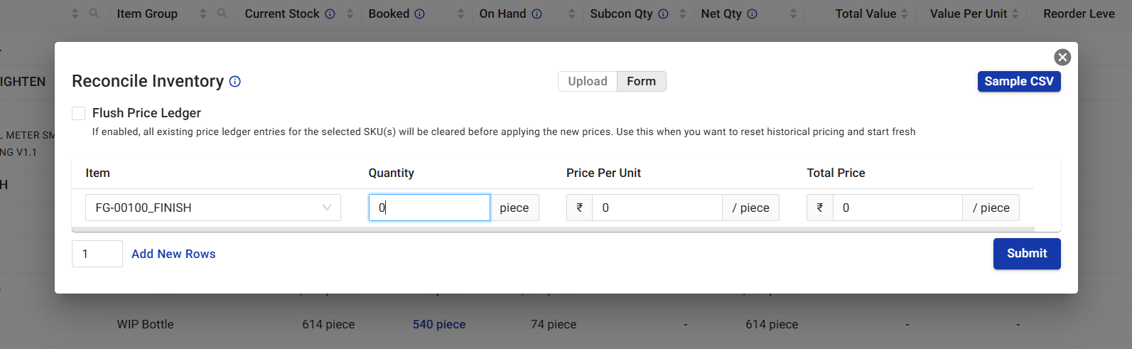 Find the item you want to reconcile (e.g., FG-00100_FINISH).