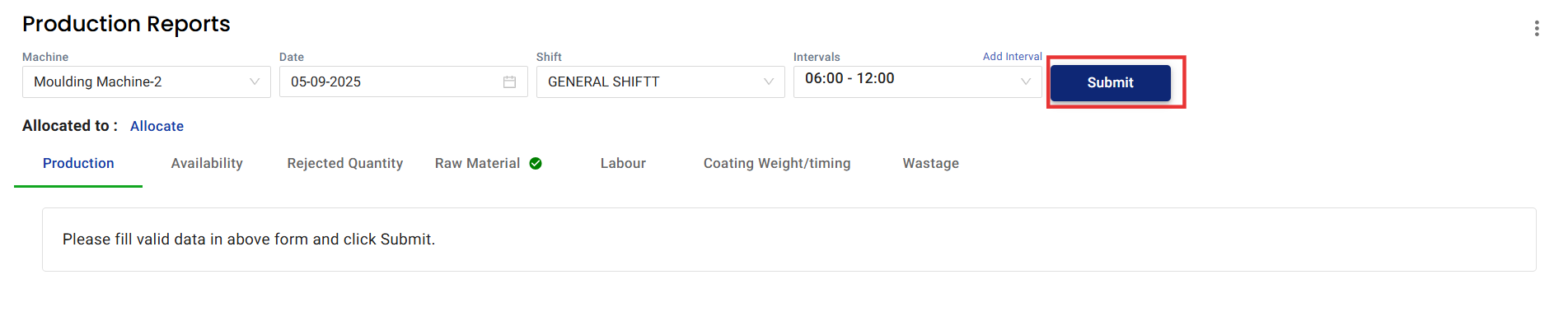 2. Select the Machine, Date, Shift, and Interval, then click Submit.
