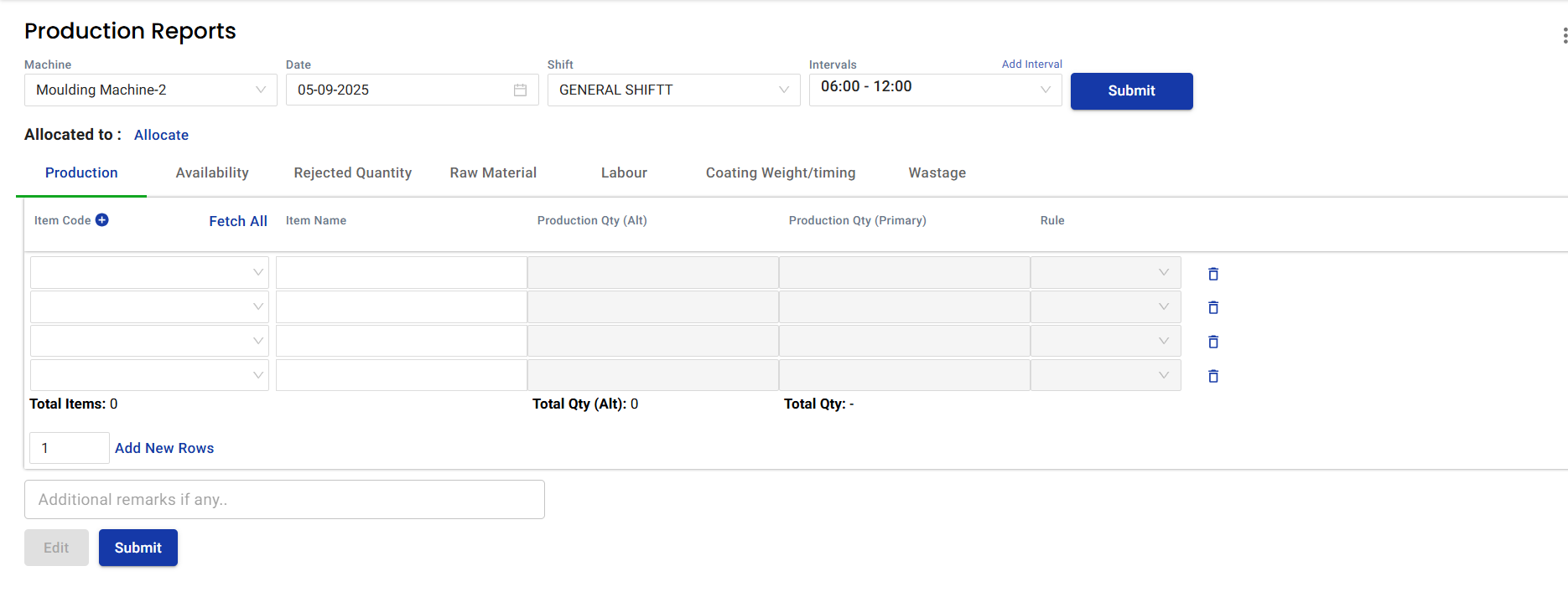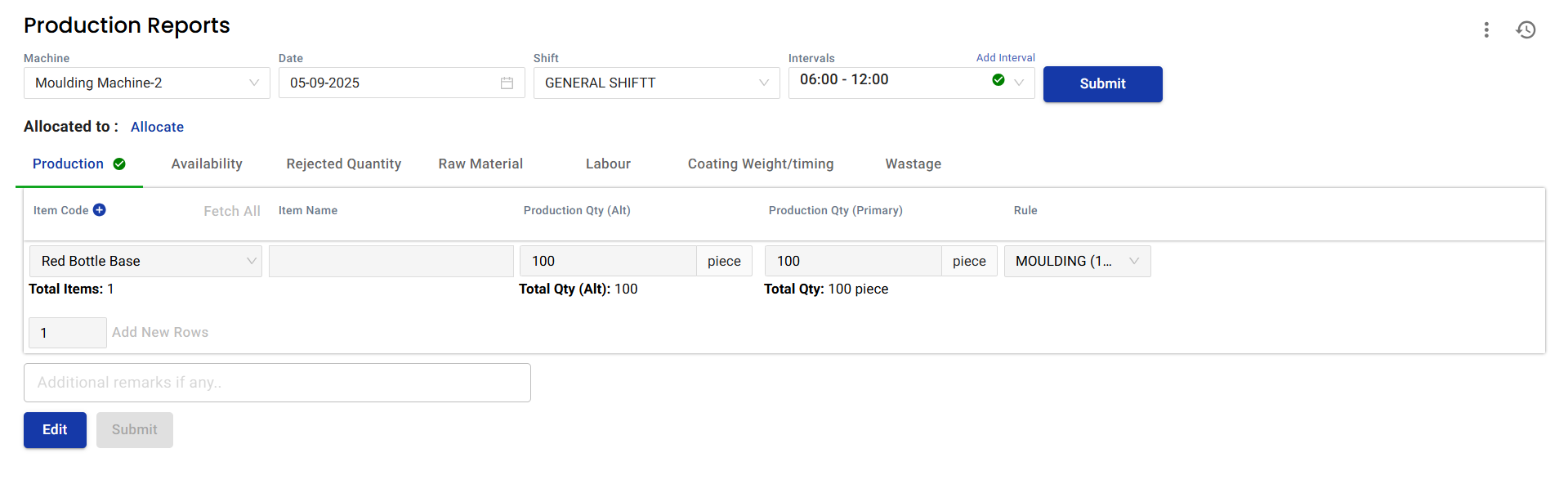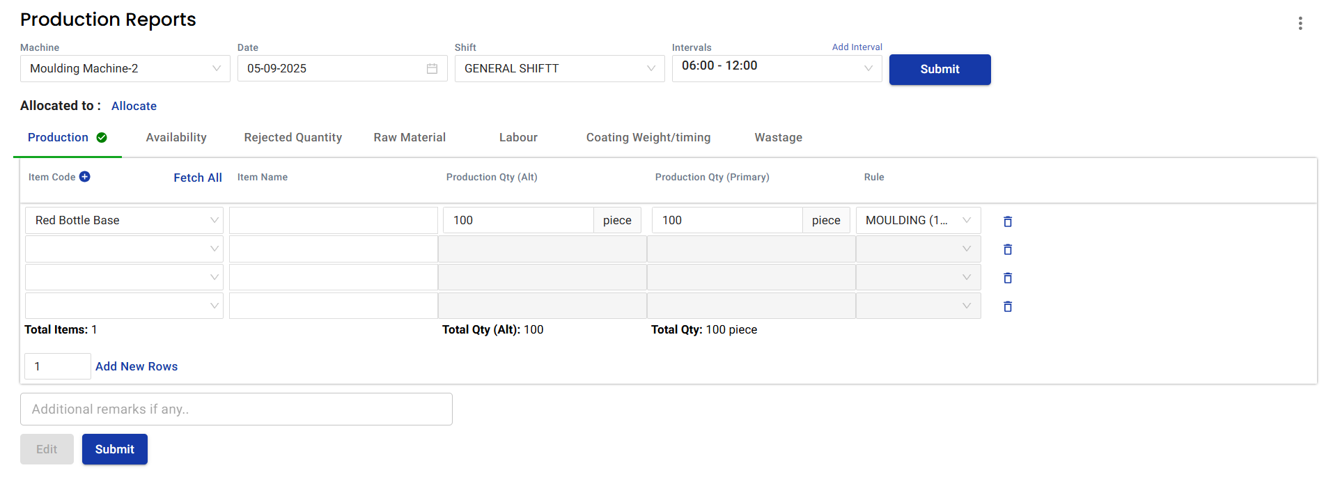 (Optional) Add remarks if needed (e.g., Trial run / Rework quantity).