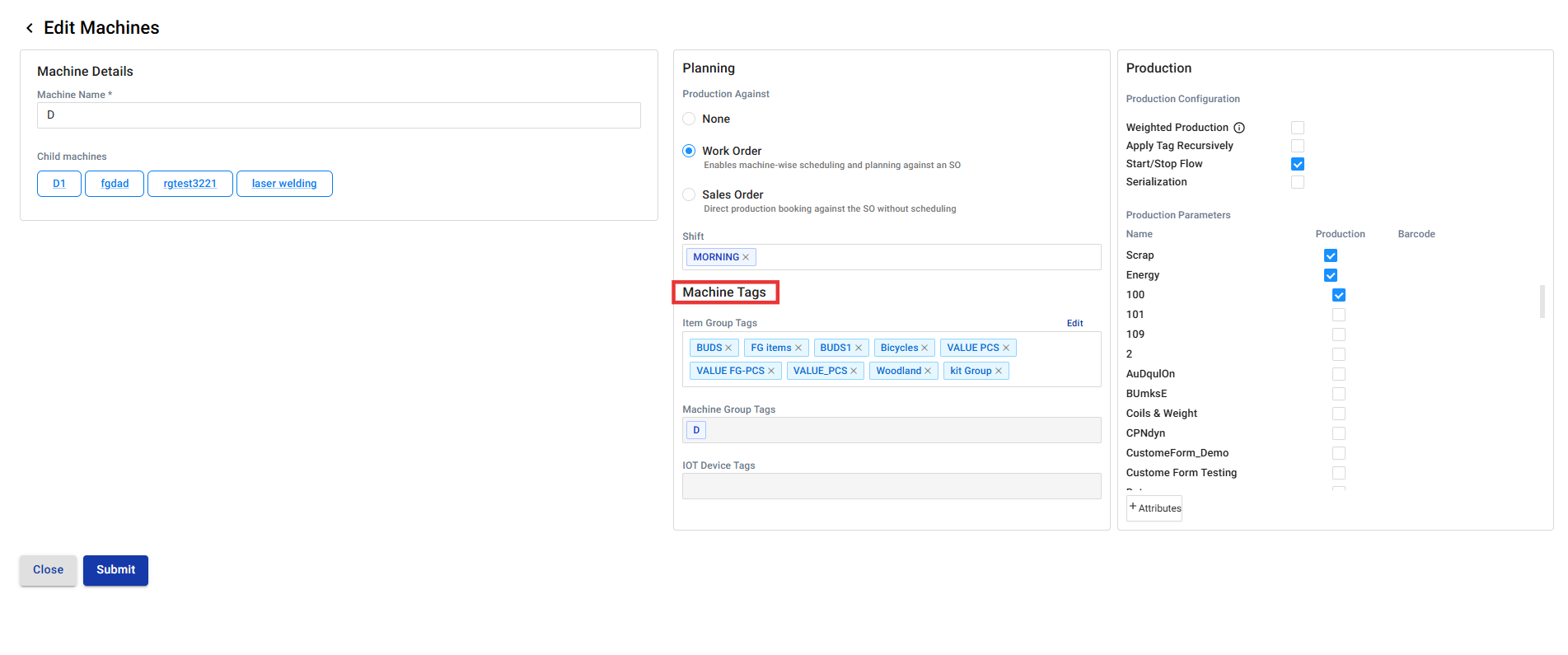 Tags link machines to specific item groups or categories. This helps in filtering which machines are used for which types of products or operations. Purpose: Used in planning and item-wise machine selection Improves traceability and filtering in ...