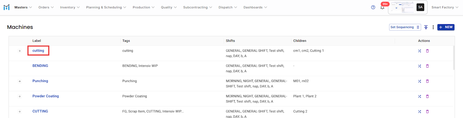This guide walks you through the process of creating machines, defining child machines, and configuring them for production tracking in ManufApp. π For a quick overview, see: What is a Machine? Step 1: Go to Machines Navigate to Masters > Machines ...