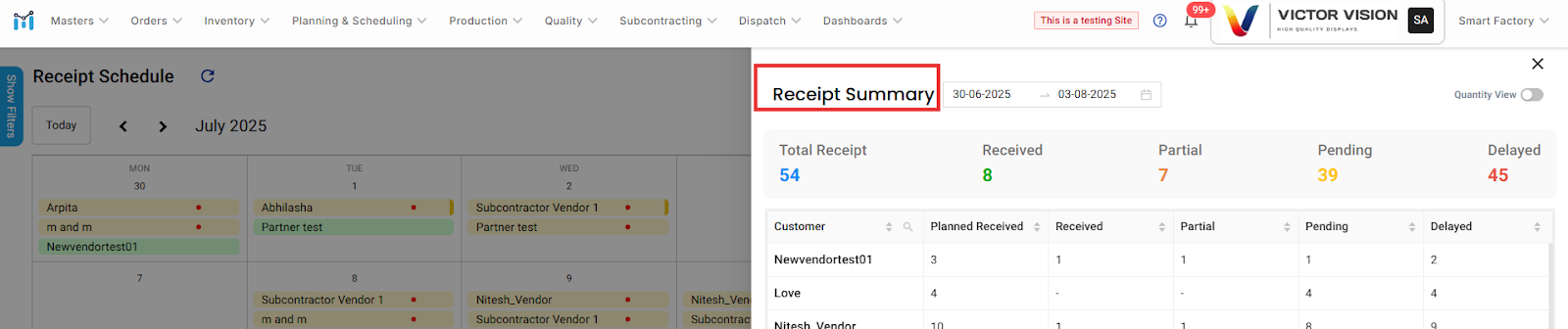 The Receipt Summary in ManufApp offers a quick, actionable overview of all planned vs. actual receipts, helping teams track delays, monitor vendor performance, and ensure timely material availability—right from a single dashboard.