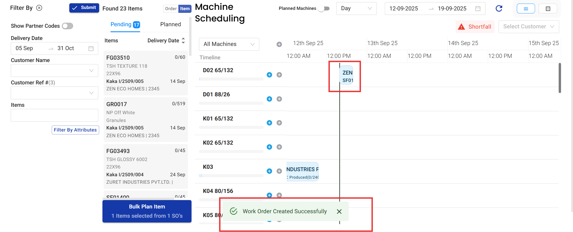 You have successfully created and scheduled a Work Order from the Machine Scheduling screen. The WO is now visible in the timeline and ready for execution tracking.