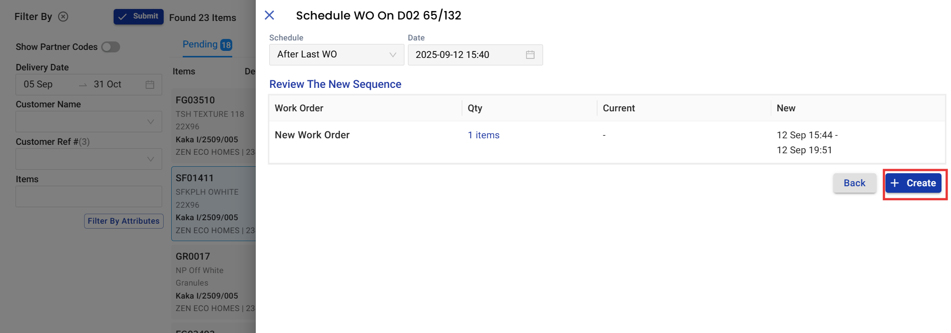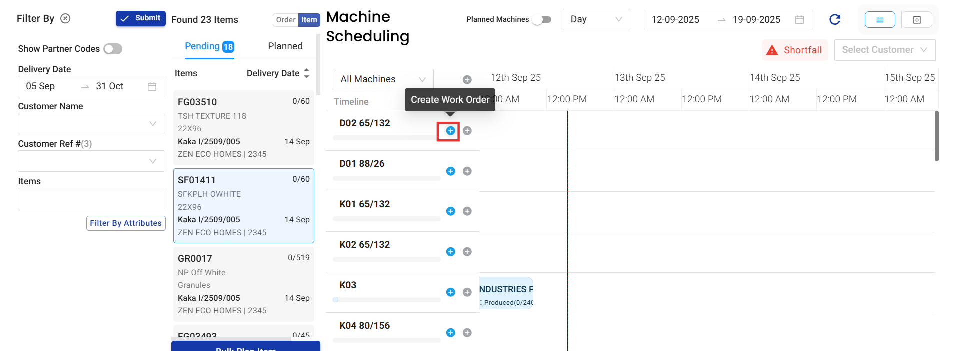Guide planners on how to create and schedule Work Orders (WO) directly from the Machine Scheduling screen: select pending Sales Order items, choose a target machine and time, review the sequence, and confirm creation.