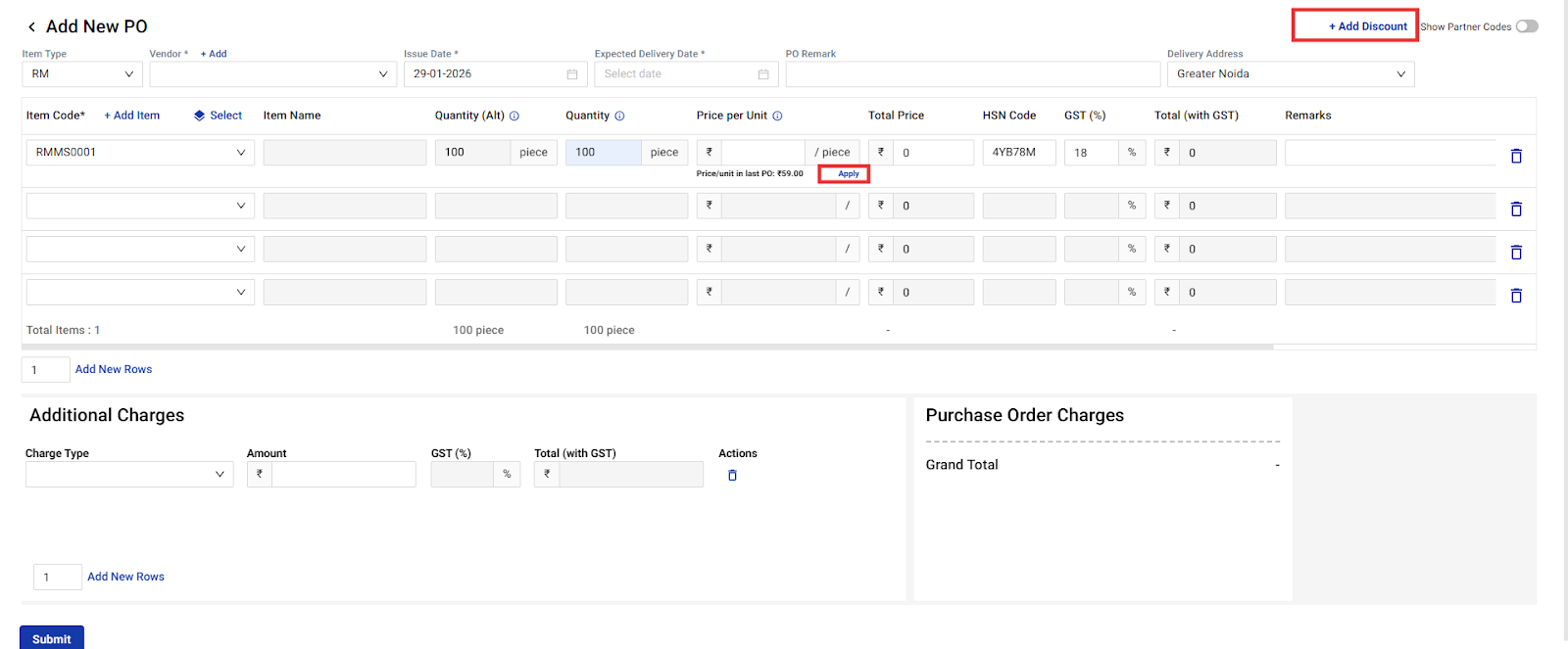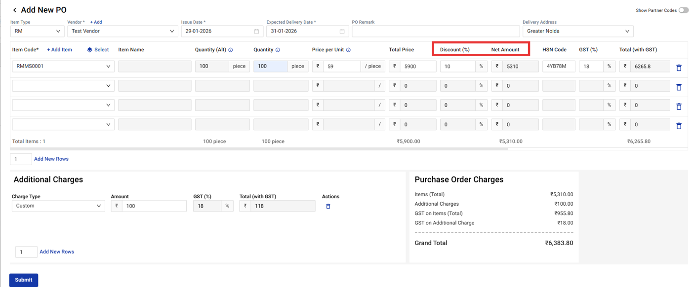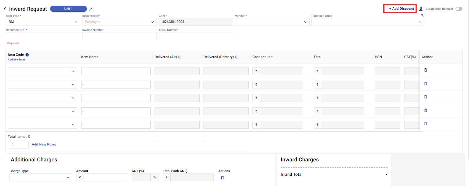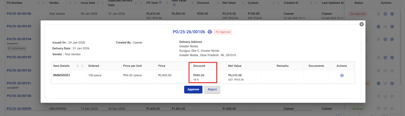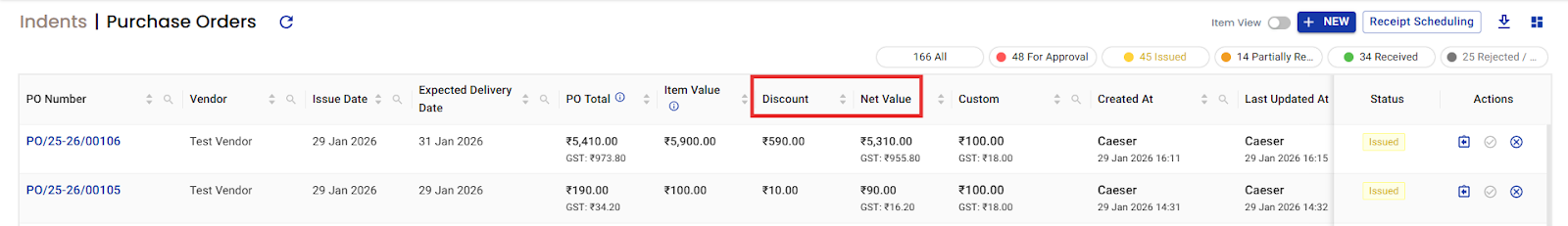 Introduce clear, item-level discount handling in Purchase Orders and GRNs so that base price, discount, and net value are explicitly captured and consistently used across procurement, inward, inventory valuation, and reporting—without manual adjustments or data mismatch.