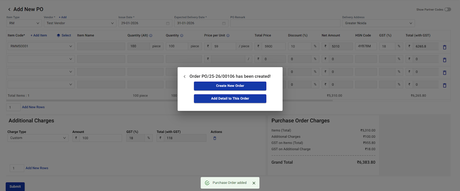 Item Type, Vendor, Issue Date, Expected Delivery Date, Delivery Address, Remarks