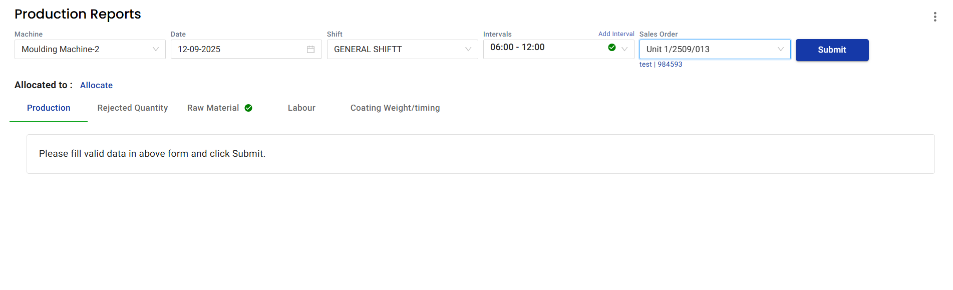 Select the Machine, Date, Shift, and Interval.
