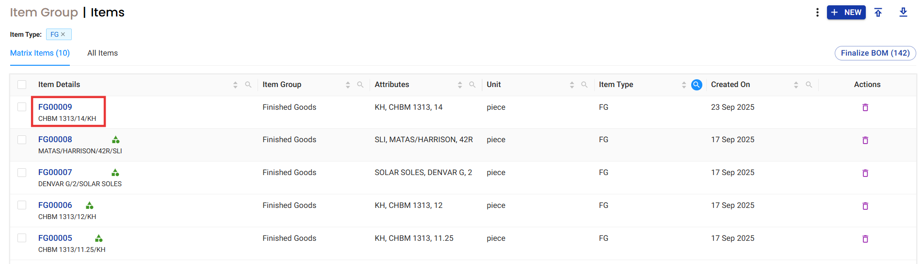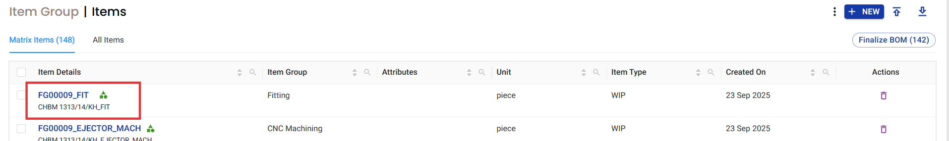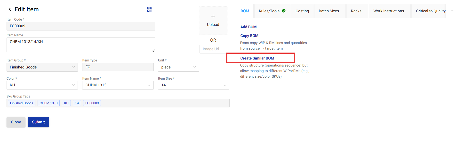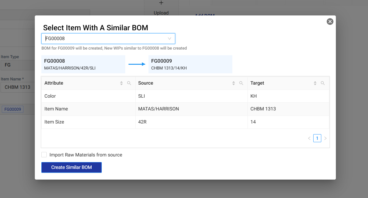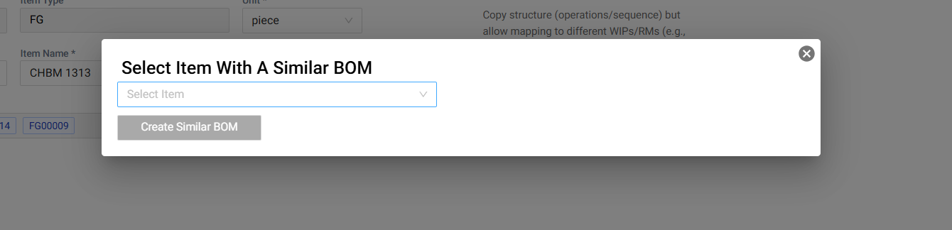 In the Item List, find and select the Finished Good (FG) for which you want to create a Similar BOM.