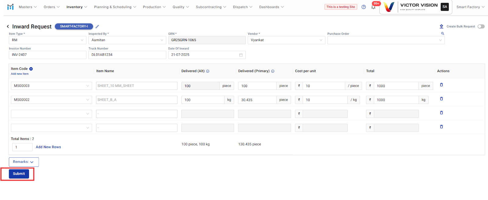 Use this guide when materials are received against a pre-approved Purchase Order (PO) — ensuring consistency and traceability in procurement. For a quick overview, see: What is an Inward Request in ManufApp? Step 1: Navigate to Inward Request Go to: ...
